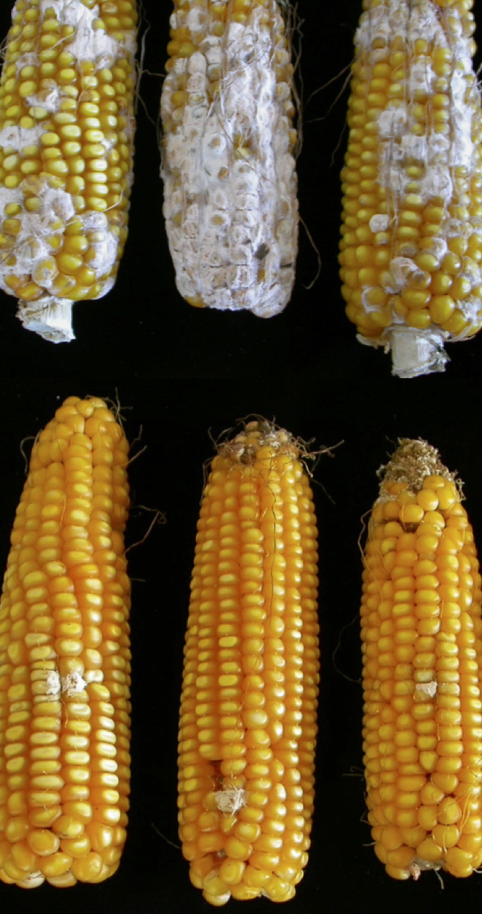 Spighe di genotipi di mais suscettibili alle infezioni fungine da Fusarium verticillioides (in alto) e di genotipi resistenti (in basso) ottenuti mediante NBT.