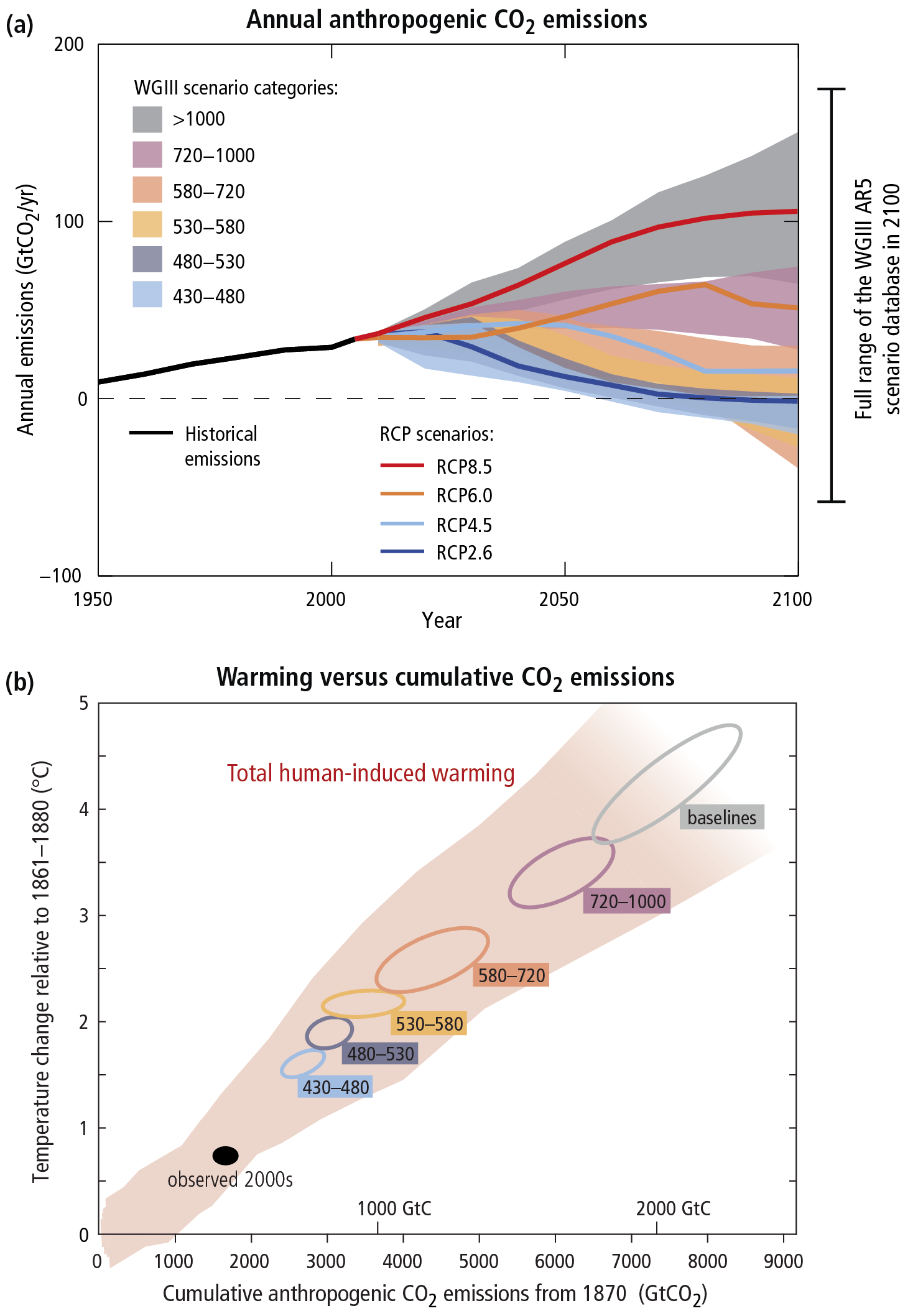 Il ruolo della base scientifica per sostenere politiche climatiche è sempre stato fondamentale, e l’Intergovernmental Panel on Climate Change (IPCC) produce dal 1990 i suoi assessment di evidenza scientifica a sostegno delle politiche globali (si veda IPCC, 2014, AR5 Synthesis Report. Il prossimo assessment è previsto nel 2022). Gli scenari di riferimento degli IPCC indicano, non solo un ruolo critico dell’azione umana nel causare il cambiamento, ma anche un ruolo decisivo dell’azione umana per controllarlo. Lo scenario peggiore di IPCC (RCP8.5), quello in cui manca una forte politica globale, prevede un aumento di temperatura al 2100 fino a +5°C, con effetti catastrofici. Nell’altro scenario estremo (RCP2.6), quello in cui si attua una forte riduzione immediata delle emissioni di gas serra, vale a dire un picco di emissioni al 2020, la crescita della temperatura media si attesterebbe fra 1,5°C e 2°C nel periodo 2081-2100, rendendo ancora governabili gli effetti del cambiamento climatico (vedi figura 1). Diverse analisi indicano un quadro climatico in peggioramento nonostante le politiche in atto (Pihl et al. 2019).