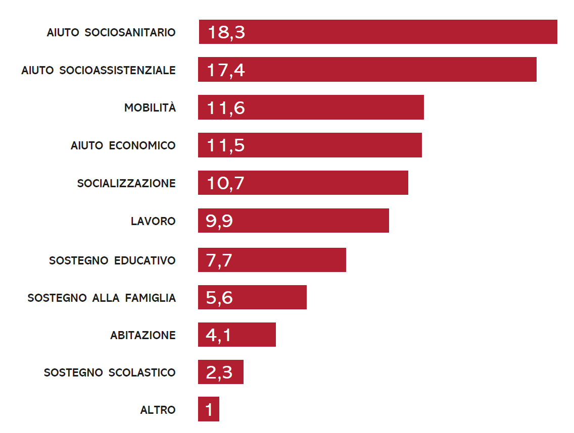 Dallo studio emerge che gli aiuti richiesti più frequentemente, perché non ricevuti o ricevuti in misura insufficiente rispetto ai bisogni, riguardano l’assistenza sociosanitaria e quella sociale, rispettivamente indicate nel 39% e nel 37% dei casi, la mobilità (spostamenti verso l’esterno), indicata nel 25% dei casi, l’aiuto economico con il 24%, la socializzazione con il 23%, e il lavoro indicato in un quinto dei casi.
