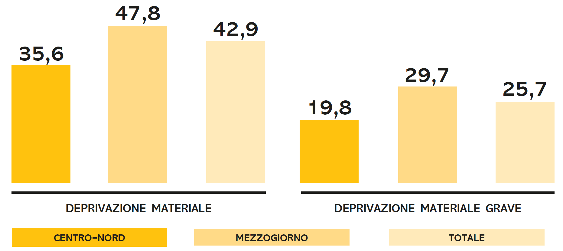 Poco più di una persona su quattro vive in una famiglia che non può permettersi di mangiare carne o pesce, almeno una volta ogni due giorni; il 22% non riesce a riscaldare adeguatamente la propria abitazione di residenza.