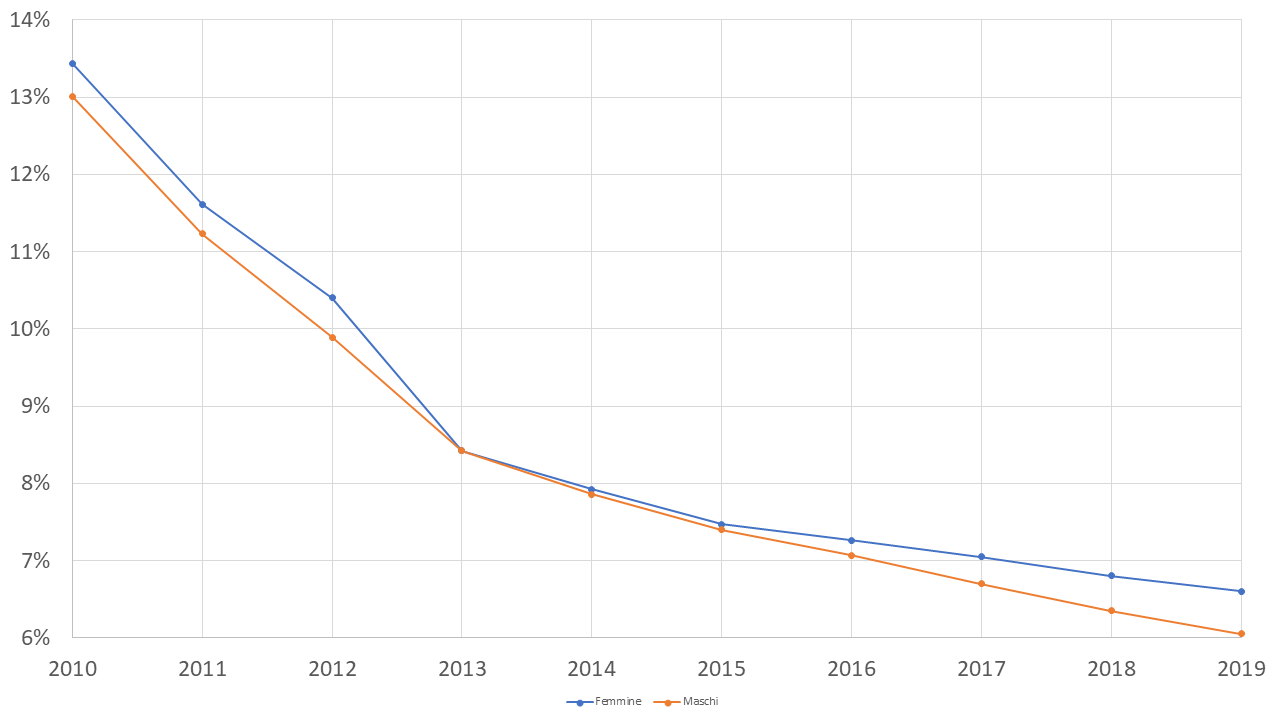 Anche in questo caso, le donne risentono maggiormente di questo fenomeno, pur con una differenza contenuta e, come si evince dal grafico che segue, all’interno di un fenomeno che è molto migliorato negli ultimi anni.