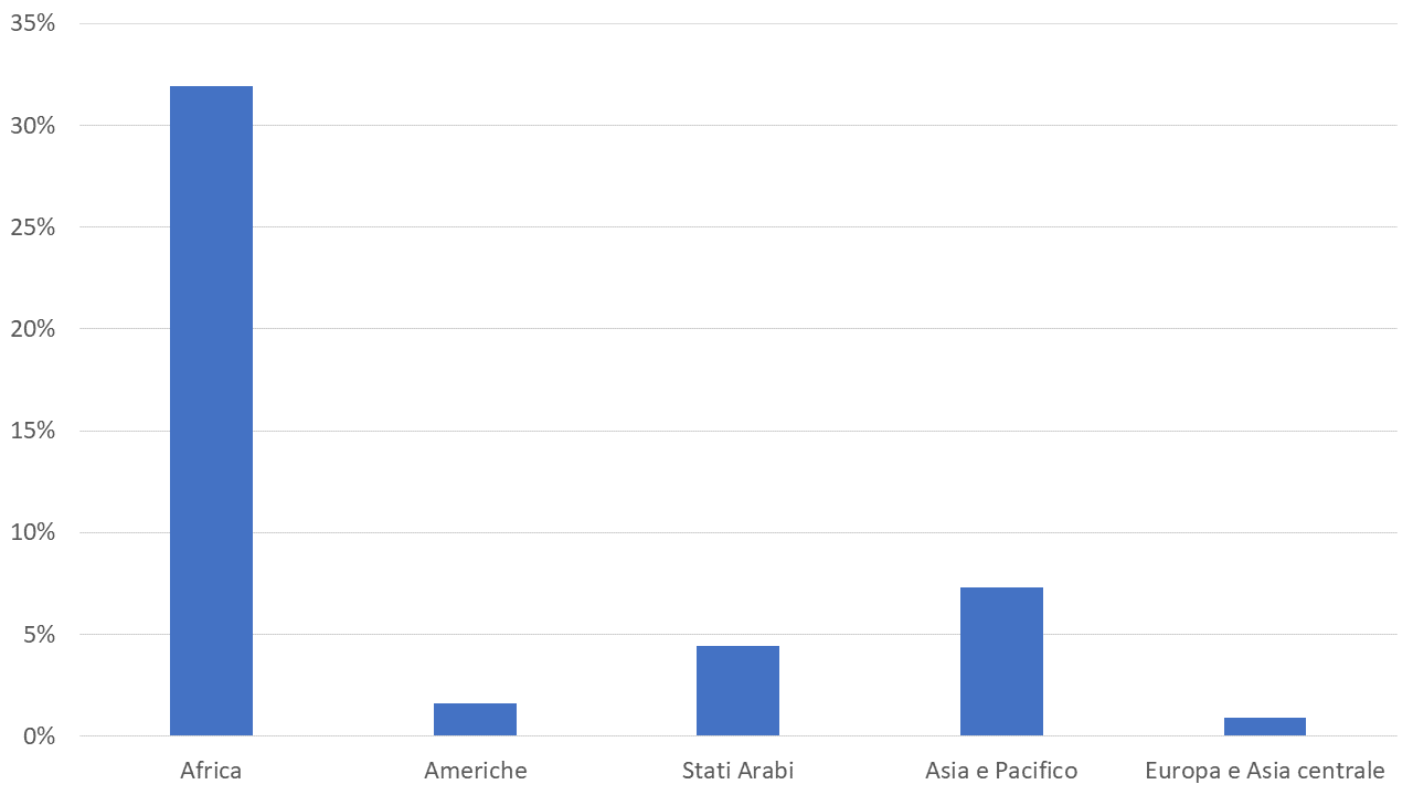 Figura 1 - Tasso di povertà lavorativa per aree geografiche (% di occupati che vivono al di sotto di 1,90 USD al giorno)