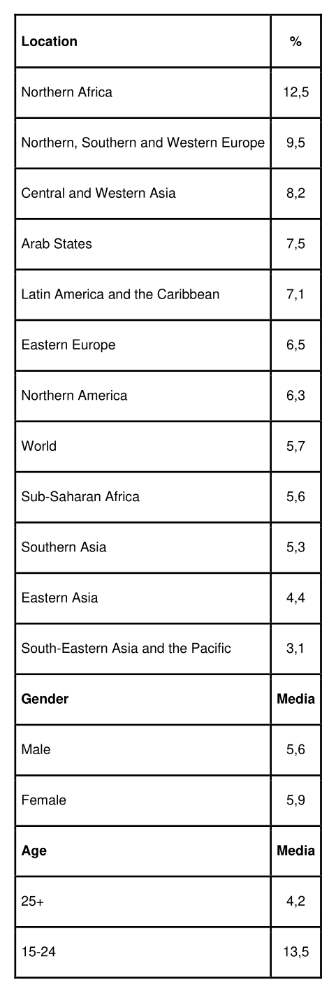 Secondo l’ILO (International Labour Organization), nel 2019 nel mondo vi erano quasi 190 milioni di disoccupati, che corrisponde ad una percentuale del 5,4%. Come si evince dalla tabella che segue, che riporta percentuali medie dal 2010 al 2019, questo dato varia a seconda della collocazione geografica, del genere e dell’età. La zona maggiormente colpita è quella del Nord Africa, seguita dall’Europa nord-sud-occidentale, dall’Asia centro-occidentale e dagli Stati Arabi. Le donne risentono maggiormente di questo fenomeno, così come i più giovani.