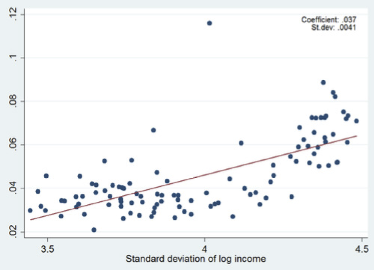 Empiricamente si è mostrato come esista una regolarità nell’associazione tra disuguaglianza e mobilità dei redditi: in generale, Paesi o regioni ad elevata disuguaglianza sono anche quelli a bassa mobilità, relazione nota come Curva del Grande Gatsby (Corak, 2013). I grafici qui sotto mostrano la Curva del Grande Gatsby in due differenti ambiti. Nel primo si guarda alla relazione confrontando diverse Nazioni; nel secondo caso si mostra la curva tra le province italiane. Il fatto che la relazione sia stabile a prescindere dal contesto in cui viene analizzata suggerisce che la relazione empirica è robusta. Il significato sostanziale è che la disuguaglianza dei redditi si accompagna sempre alla immobilità sociale, e per questo è da ritenersi un sintomo di disuguaglianza nelle opportunità che come tale va affrontato dal policy maker.