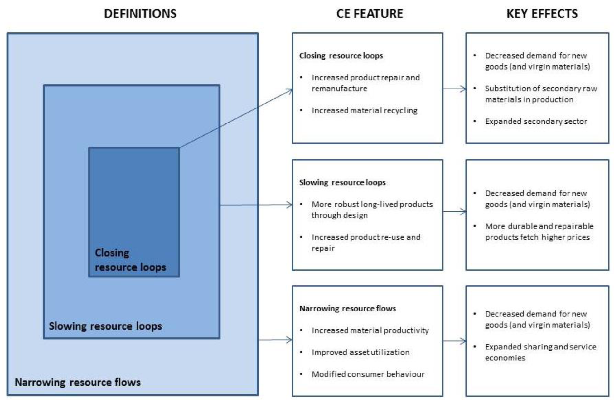Lo schema concettuale oggi forse maggiormente ampio e generale risulta quello proposto dall’OECD (2017), nel quale vengono individuati 3 “livelli” di economia circolare che comportano diversità di attività, di strategie di produzione e/o consumo, e di conseguenti implicazioni economiche. Secondo questo schema, se si abbraccia una definizione riduttiva di economia circolare, questa consiste sostanzialmente nella (crescente) “chiusura” del ciclo dei materiali attraverso il loro riciclo, il recupero energetico dei rifiuti e il ri-utilizzo delle materie e dei prodotti, anche dopo la ri-lavorazione (re-manufacturing) dei prodotti compositi o delle loro parti (ad esempio nel settore automobilistico). Tale livello presenta quindi come aspetto focale il lato “preventivo” della circolarità, ossia il momento della fabbricazione dei prodotti nell’ottica del loro riciclo/recupero/riutilizzo.