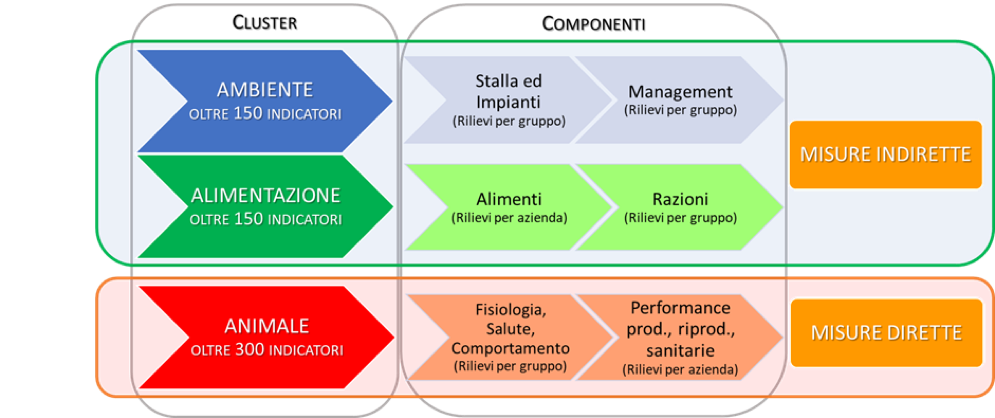Ciò renderebbe accettabili i sistemi di allevamento ben gestiti all’intera società civile e, al tempo stesso, contrasterebbe qualsiasi avversione al cambiamento da parte degli allevatori, poiché gli ovvi miglioramenti produttivi ne faciliterebbero l’attuazione. Nella figura 1 è riportato lo schema di valutazione del benessere proposto per gli allevamenti di bovine da latte, che si articola in 3 clusters e 7 componenti, ognuna delle quali include la valutazione di decine di indicatori.