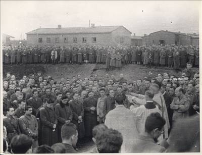 "Cerimonia della Cresima", lager di Sandbostel, 1° ottobre 1944, fotografia di Vittorio Vialli appartenente all'Archivio Vialli e conservata presso l'Istituto Storico Parri.