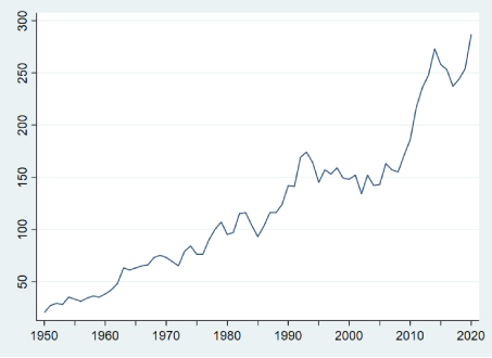 Utilizzando i dati del Global Sanctions Database (GSDB) (Felbermayr et al. 2020) è possibile trarre alcuni spunti interessanti. La figura 1 mostra come, a partire dal 1950, il numero di sanzioni in vigore è cresciuto notevolmente, passando da circa 50 nei primi anni ’60 a più di 250 attuali (il dato più recente non include le sanzioni alla Russia adottate nel 2022). Ovviamente, poiché le sanzioni tendono ad essere implementate per periodi abbastanza prolungati (la durata media nel campione osservato è di circa 9 anni) il loro numero tende a crescere nel tempo; tuttavia, se si prende in considerazione il numero di nuove sanzioni, anche quest’ultimo cresce nel tempo.