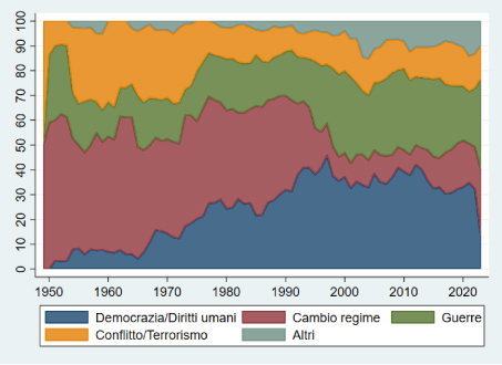 A partire dagli anni ‘90 le importanze relative si sono invertite. Mentre sino al 1990 gli obiettivi di cambiamento di regime hanno rappresentato in media il 44% degli obiettivi delle sanzioni e quelli orientati alla tutela della democrazia o dei diritti umani solo il 14%, dal 1990 i valori sono cresciuti rispettivamente al 15% e al 35%.