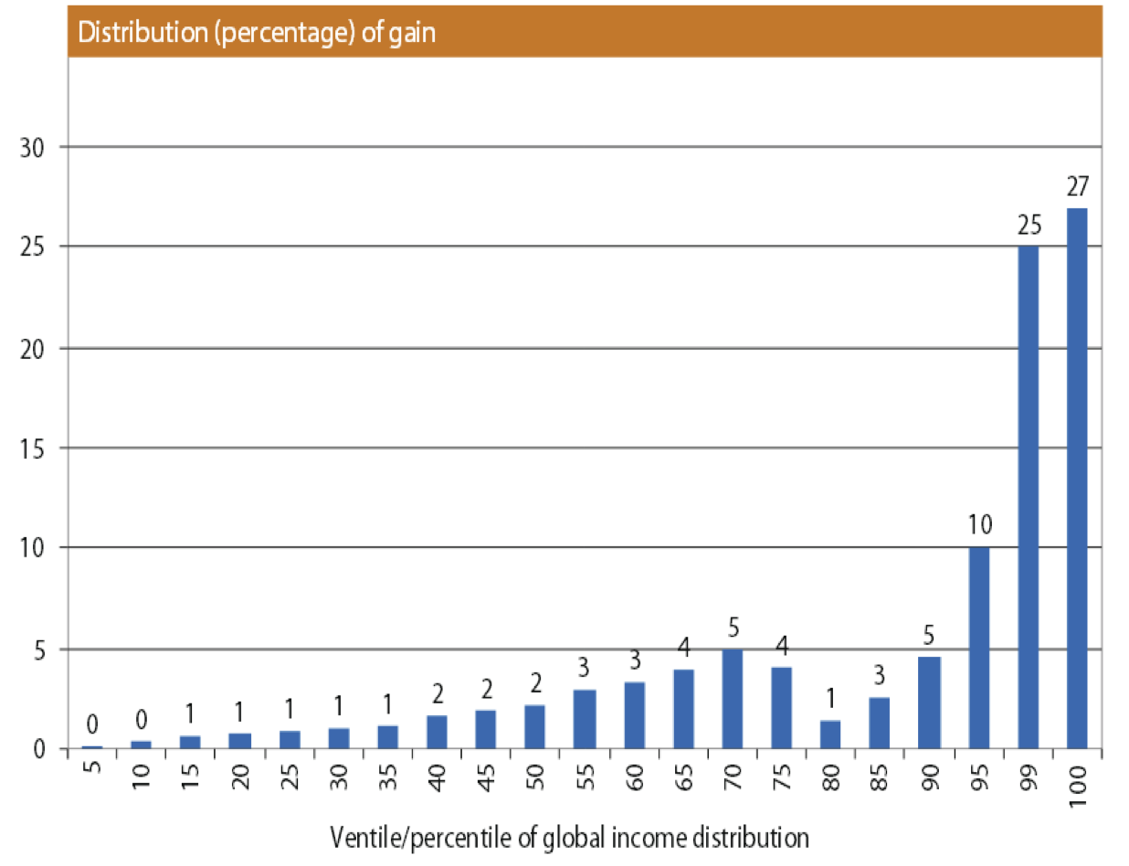 Guardando i dati di Milanovic in termini di quote (figura 3), possiamo vedere che il 2% più ricco della popolazione ha beneficiato del 52% dalla nuova ricchezza prodotta a livello mondiale, lasciando al resto del mondo meno della metà della torta, e il 50% più povero con solo il 10%: ciò significa che mediamente quando un individuo rappresentativo della metà più povera della popolazione mondiale (e di molti lavoratori nei nostri Paesi) guadagna un dollaro di reddito in più, un rappresentante del 2% più ricco ne guadagna 130. In termini aggregati, affinché la metà più povera della popolazione mondiale possa avere un dollaro in più di reddito (3,7 miliardi in tutto), la produzione e il consumo globale devono crescere di 37 miliardi di dollari, di cui oltre la metà (19 miliardi) andranno ad una élite di circa 148 milioni di persone (il famoso 2% di Milanovic).